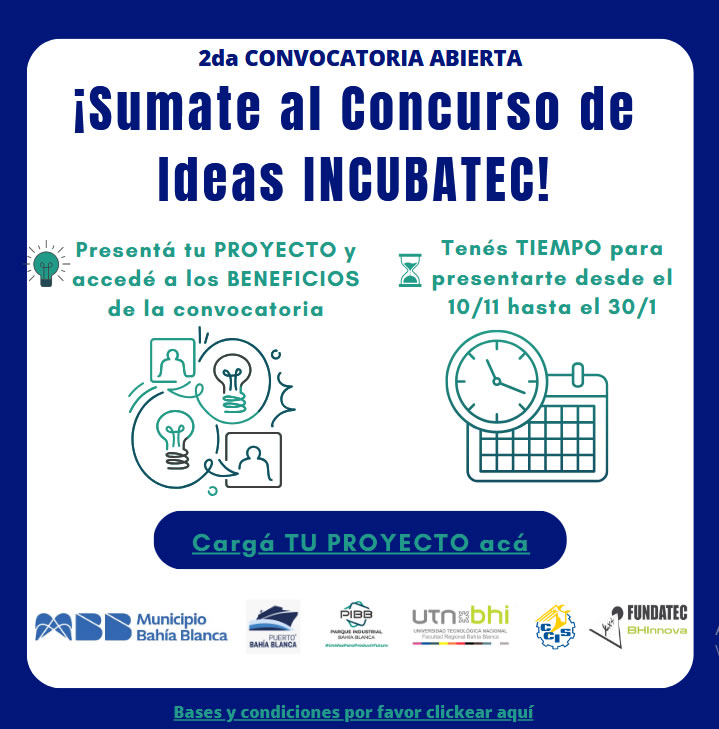 Recepción de Ideas-Proyecto: del 10 de noviembre de 2025 al 30 de enero de 2026. El lunes 10 de noviembre de 2025, en instalaciones del Parque Industrial de Bahía Blanca, se llevó a cabo el lanzamiento del Segundo Concurso de ideas-proyectos, INCUBATEC. La ceremonia congregó a destacadas autoridades de los ámbitos gubernamental, académico y empresarial. INCUBATEC tiene como misión fundamental impulsar y acompañar a emprendimientos y pequeñas empresas con potencial de crecimiento, buscando transformarlos en proyectos de impacto significativo. De esta manera, se colabora directamente con el desarrollo sostenido, no solo del Parque Industrial y su matriz productiva, sino también de la comunidad y la región en general.